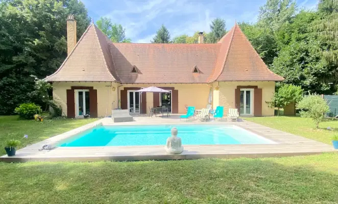 MAISON PÉRIGOURDINE 4 CHAMBRES AVEC PISCINE & GÎTE AIRBNB À CHANCELADE ! Venez découvrir cette magnifique maison de 185 m² située à Chancelade offrant un cadre de vie unique ! Dès l’entrée, vous serez charmé par son élégance et son authenticité. Nichée dans un écrin de verdure d’environ 9230 m2 tout en étant à deux pas des commodités, cette propriété allie confort moderne et charme périgourdin. C’est la campagne à la ville ! Elle est composée en RDC d’une entrée donnant sur une cuisine aménagée et équipée, d’un cellier, d’une première chambre aménagée en salle de jeu et d’un grand salon / séjour avec une belle hauteur sous poutre. Celui-ci est complètement traversant et donne sur une terrasse extérieure d’environ 100 m2 avec piscine. Il dessert également un coin nuit composé de deux chambres, d’un WC et d’une salle de bains composée d’un meuble double vasque et d’une baignoire. À l’étage, vous retrouvez un joli espace bureau / salle de jeu sous poutre et donnant sur le salon / séjour d’une part ainsi qu’une grande chambre avec salle d’eau (douche, meuble simple vasque et WC) d’autre part. Enfin, une dépendance est également présente sur la parcelle et totalement indépendante. Elle se compose d’un gîte d’environ 65 m2 utilisé et loué en location saisonnière type airbnb, booking ainsi qu’un garage d’une superficie d’environ 40 m2.
